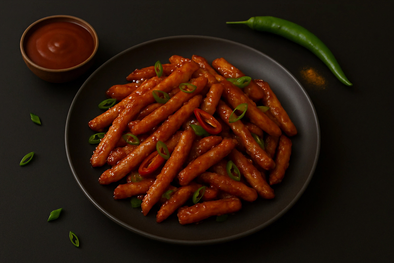 Crispy potato fingers coated in a tangy and spicy chili sauce.